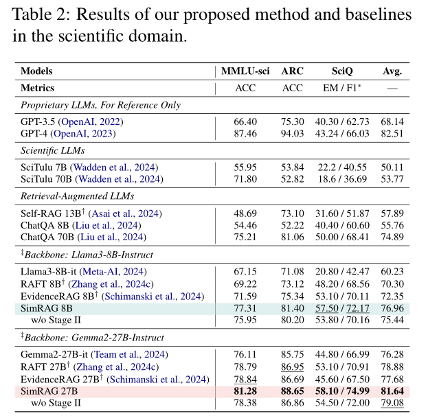 结果显示,SimRAG在三大领域均显著优于基线模型,核心原因可归结为两点: