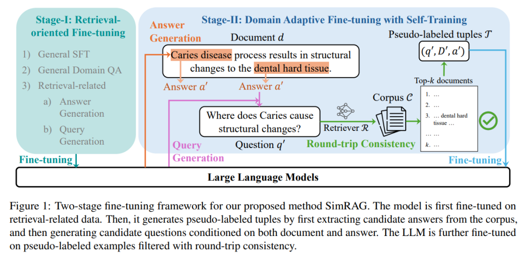 SimRAG的核心创新在于“自训练+两阶段微调” :先让模型在通用领域掌握“检索-问答”的基础能力,再利用专业领域的未标注语料,让模型自主生成高质量伪标注数据,实现“自我改进”。其整体框架如下图所示: