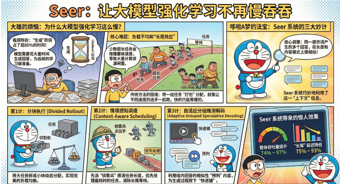 Seer 就像一个极其精明的考场管理员。它先把大作文拆成小纸条(Divided Rollout)方便塞空隙;它利用先遣队探知哪个班级的题难,优先安排难的班级(Context-Aware Scheduling);最后,它允许同班同学通过共享黑板(Speculative Decoding)互相借鉴思路,越写越快。这一切结合起来,彻底消灭了“因为一个人没写完,全考场都得陪着”的低效现象。