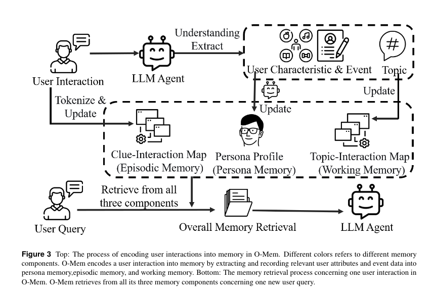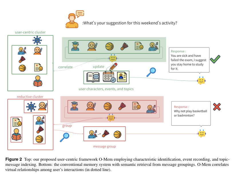 - 设计逻辑:传统系统(如 LangMem、A-Mem)依赖 “存储交互→语义分组→检索分组” 的被动模式,易遗漏非语义关键信息(如用户健康状况);O-Mem 采用主动用户画像驱动,从交互中动态提取用户属性、事件并更新,将每次交互作为迭代用户建模的机会,构建动态、多维度的用户上下文,而非依赖静态历史交互嵌入。
