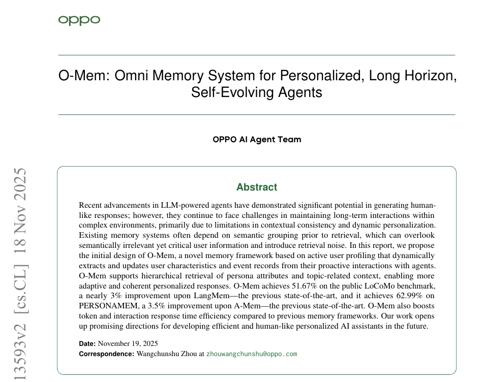 编者摘要:OPPO AI Agent Team 提出O-Mem—— 一种基于主动用户画像的新型记忆框架,旨在解决 LLM 驱动智能体在复杂环境中长期交互的上下文一致性与动态个性化难题。它通过从用户主动交互中动态提取和更新用户特征与事件记录,支持人物属性和主题相关上下文的分层检索,在公开基准测试中表现优异:在 LoCoMo 基准上达51.67%(较此前最优 LangMem 提升近 3%),在 PERSONAMEM 上达62.99%(较此前最优 A-Mem 提升 3.5%),同时相比以往记忆框架,在Token消耗和交互响应时间效率上均有提升,为开发高效、类人个性化 AI 助手提供了新方向。