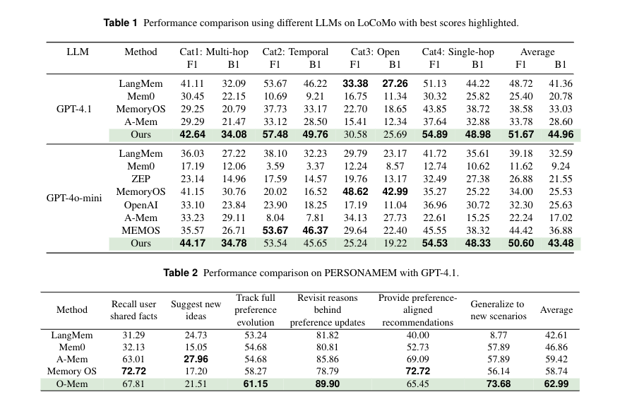 | 对比基线 | 开源框架:A-Mem、MemoryOS、Mem0、LangMem;商业框架:ZEP、Memos、OpenAI(结果源自原文献) |