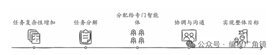 多智能体协作通过动态任务分解、专业化分工和协同工作克服这一挑战。在处理复杂任务时,系统会将任务分解为多个子任务。每个子任务由专门的智能体处理,这些智能体在特定领域具有专长。