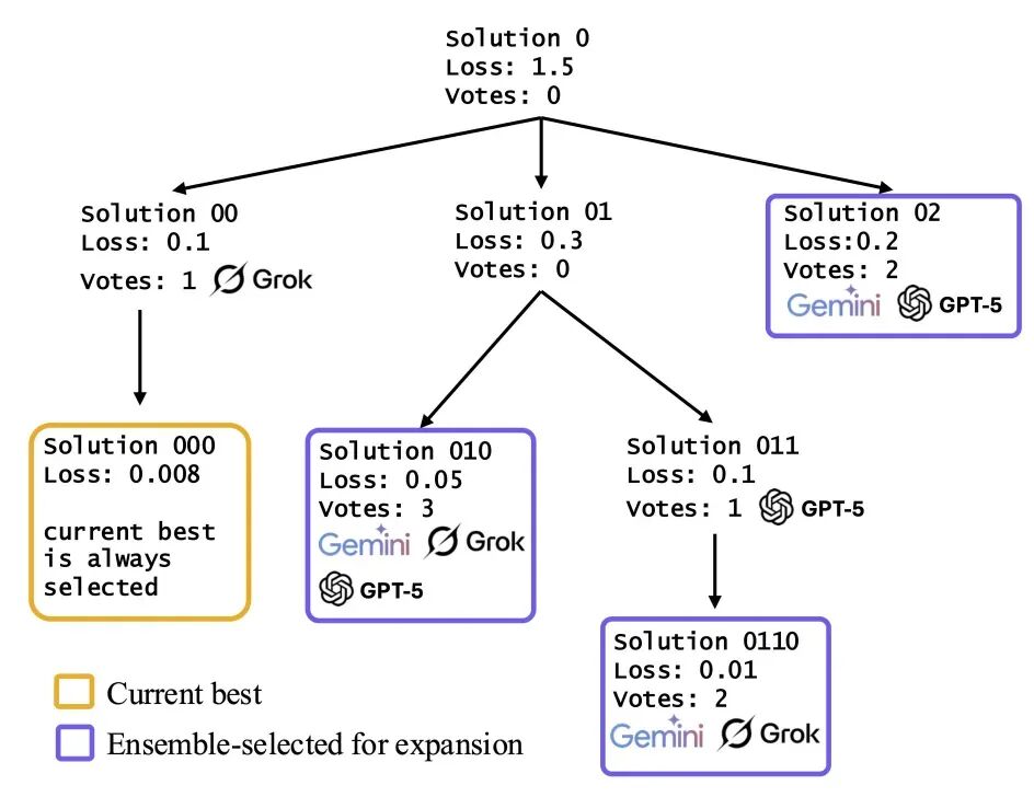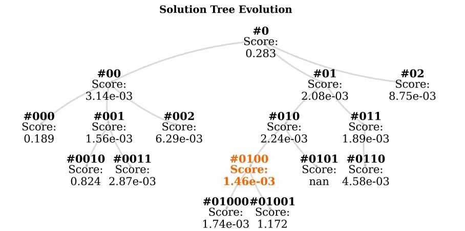 所有这些步骤共同组成了一次“科学探索循环”。系统会根据评估指标得分,选择表现最好的模型作为下一代“父模型”,并在其基础上继续探索新的变体,从而形成一个不断扩展和演化的“模型进化树”(如下图所示)。