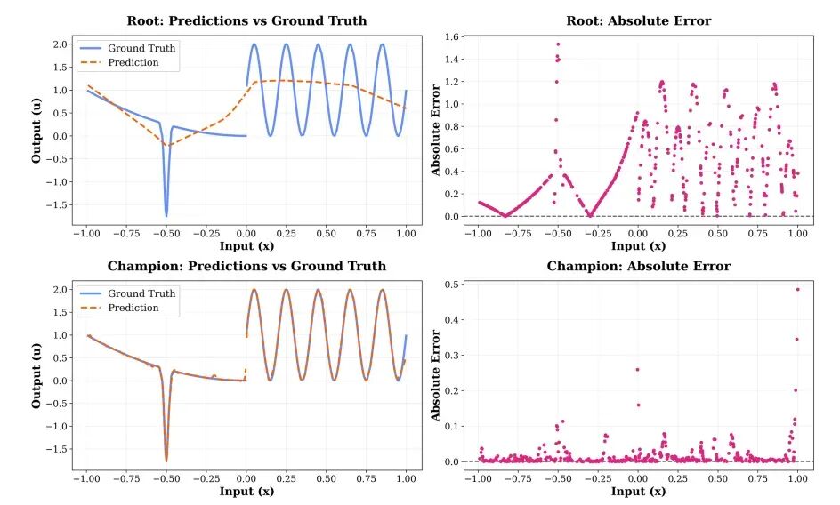 冠军解(0100)的测试MSE为1.46×10−3,比根解(0.283)提高了194倍。获胜策略采用专家混合(MoE)架构,由两名专业专家组成:一个用于x<0区域的简单MLP,另一个用于振荡区域x>0的傅里叶特征增强MLP。二者在验证数据集上的拟合结果与误差如下图所示: