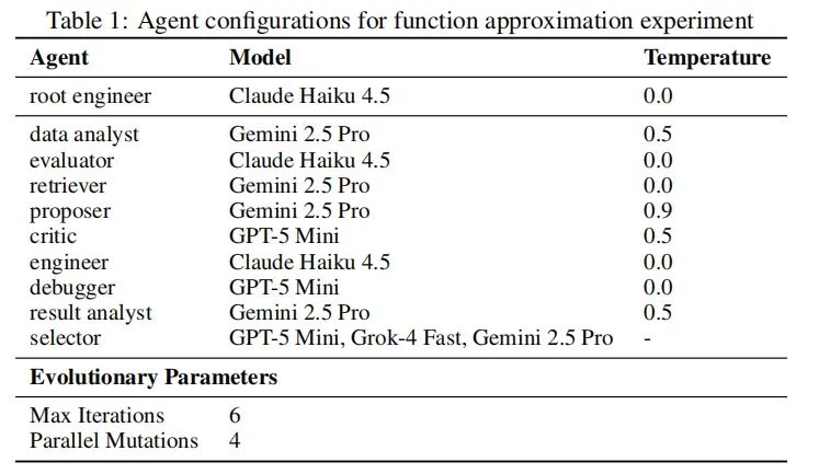 智能体选择:下表总结了本实验中使用的智能体配置和进化参数。Gemini被用作提议者,因为它的长上下文窗口能够处理大量检索到的知识和分析报告。Claude因其强大的编码能力而被用作根工程师和主要工程代理。对于需要确定性输出的代理(如根工程师、评估员、工程师、调试器),温度参数(控制探索随机性的超参数)设置得较低,而对于创造性代理(如提议者、评论家、分析师),则设置得较高: