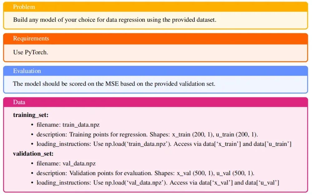 然而,系统无法访问函数的底层数学形式。他们只观察包含200个输入-输出对的训练数据集。还为模型评估提供了500个点的验证集,但在训练过程中没有泄漏。用户向系统提供了以下结构化提示: