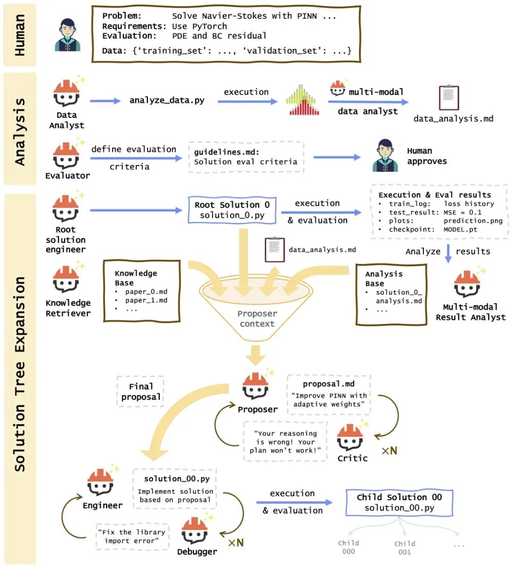 因此,AgenticSciML 的核心思想是:让不同 AI 扮演不同科研角色,让“科研协作结构”本身成为智能。不是一个大模型做所有事,而是一群分工明确的智能体协作完成科研流程。