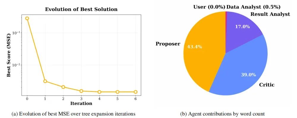 下图跟踪了进化迭代中获得的最佳MSE。最佳MSE随着解决方案树在达到平台之前变深而降低。并按字数统计显示了关键规划代理的贡献。