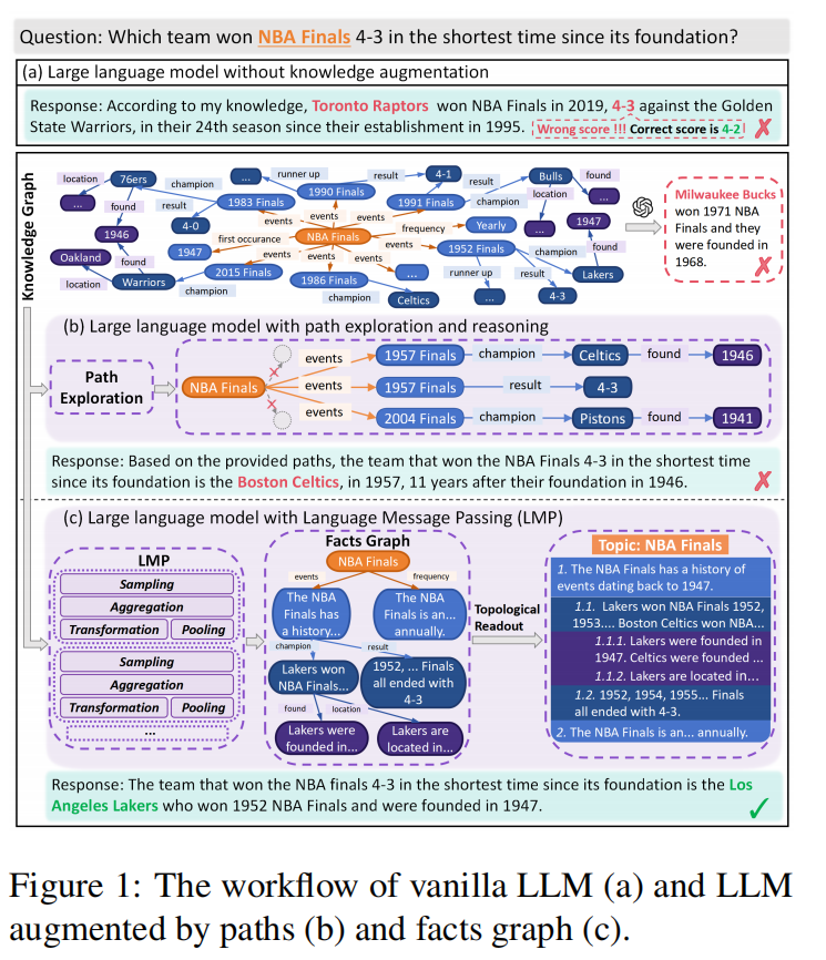 这是一个 “最高级问题”,需要所有 78 届 NBA 总决赛的比分和冠军信息才能准确回答。首先,“路径” 仅能捕捉知识图谱的 “深度信息”,缺乏对整体图结构的全局认知。其次,基于关键词的原始路径缺乏组织性,语义表达生硬,难以被大型语言模型 “消化”。即便知识图谱中包含所有必要信息,大型语言模型在回答该问题时仍会失败(如图 1 中红色虚线框所示),原因就在于这些信息分散在不同深度的独立路径中,缺乏有效组织。