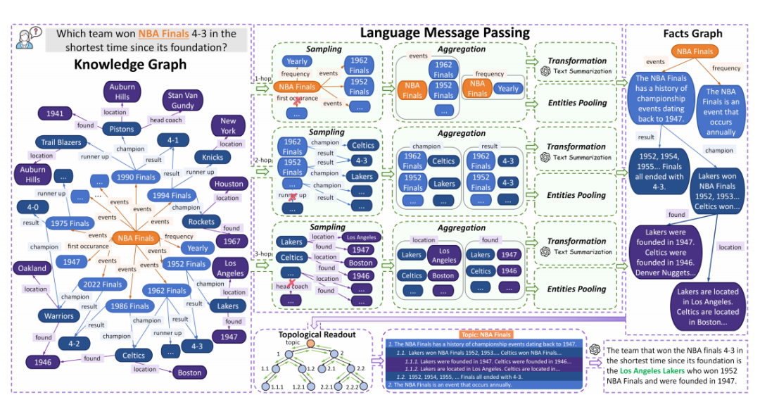 本文提出语言消息传递方法,该方法通过迭代聚合邻域信息并将其转化为摘要事实,随后利用事实图谱(节点为摘要事实)的拓扑读出机制增强大型语言模型。LMP在所有5个知识图谱问答数据集上均实现最先进性能,并提供人类可理解的语义解释性。