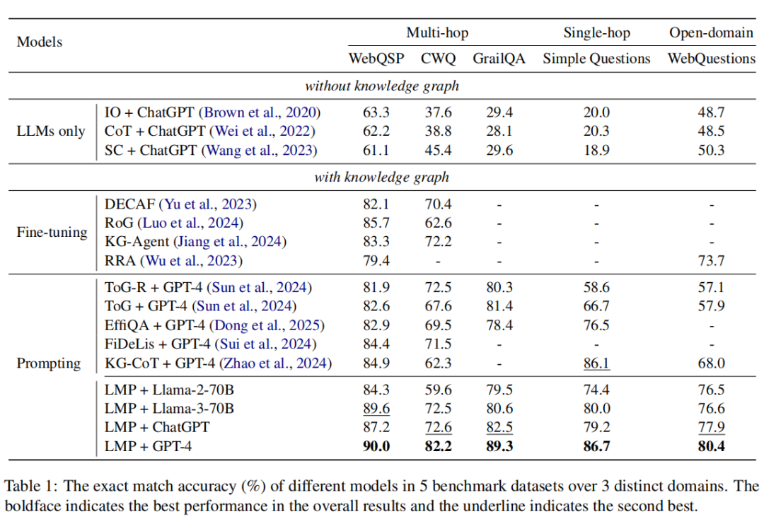 - 在 5 个知识图谱问答(KGQA)基准数据集上验证了 LMP 的有效性,其性能均超越现有方法,达到当前最优(SOTA)水平。