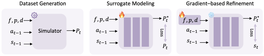 通过三步流程:以随机物理参数生成仿真轨迹、训练可微替代模型逼近系统动力学、再以梯度下降优化参数匹配真实运动,高效生成物理合理、交互可信的数据。