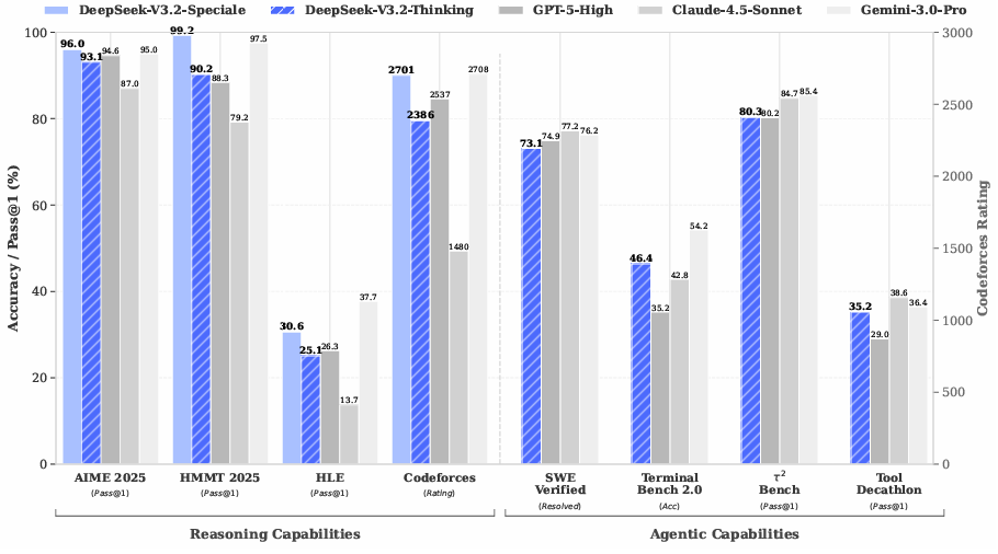 更令人振奋的是其高计算版本DeepSeek-V3.2-Speciale,在2025年国际数学奥林匹克竞赛(IMO)和国际信息学奥林匹克竞赛(IOI)中双双斩获金牌,这一成绩甚至超越了GPT-5,达到了与Gemini-3.0-Pro相当的水平。 这是中国开源大模型首次在国际顶级学术竞赛中达到金牌水平,标志着中国AI技术已进入全球第一梯队。