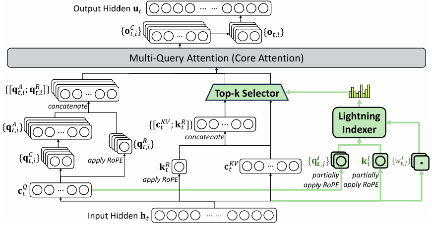 图2 | DeepSeek-V3.2的注意力架构,其中DSA在MLA下实例化