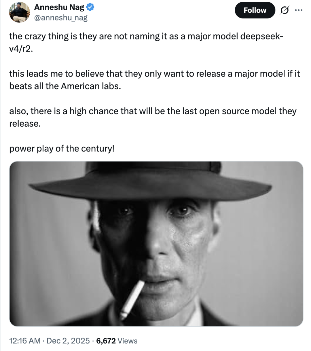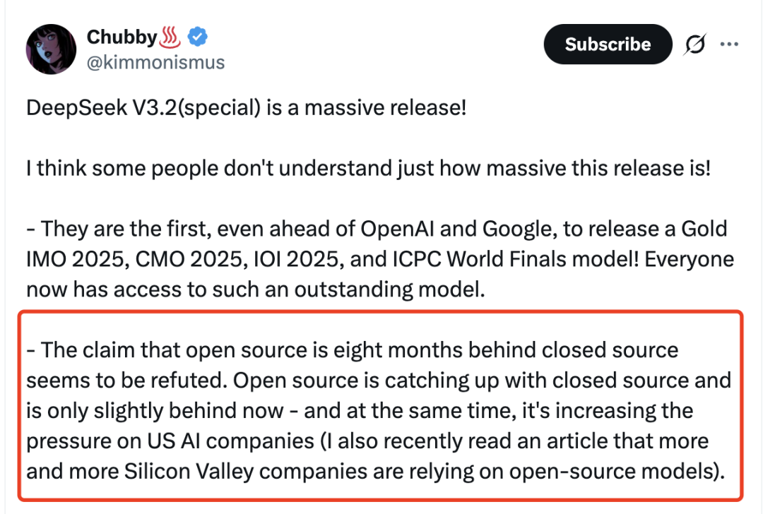 这不仅击碎了开源模型落后闭源模型半年的质疑,又顺便给硅谷的闭源AI公司好好上了一波压力。