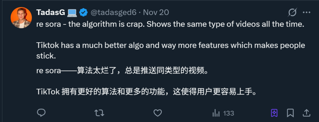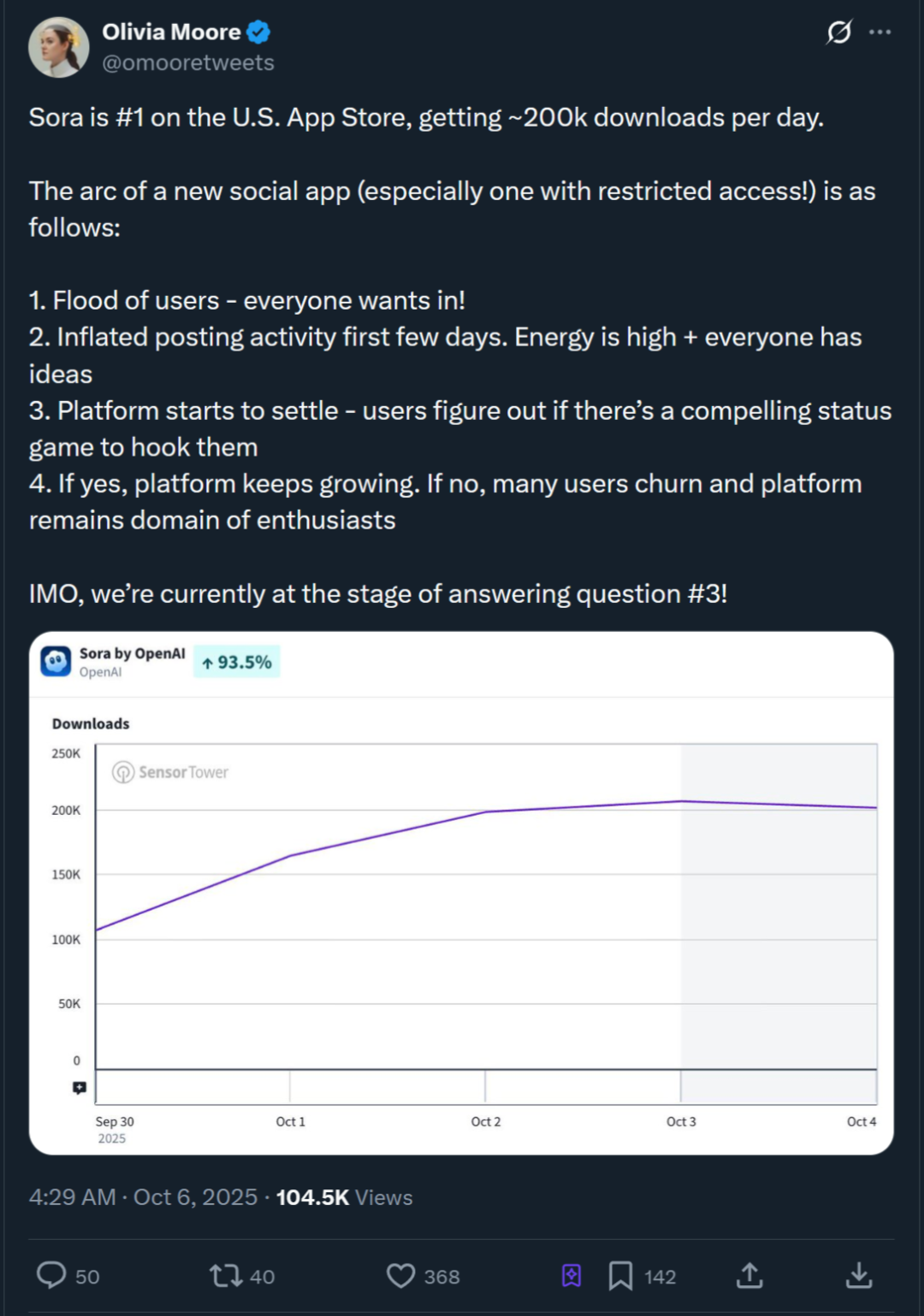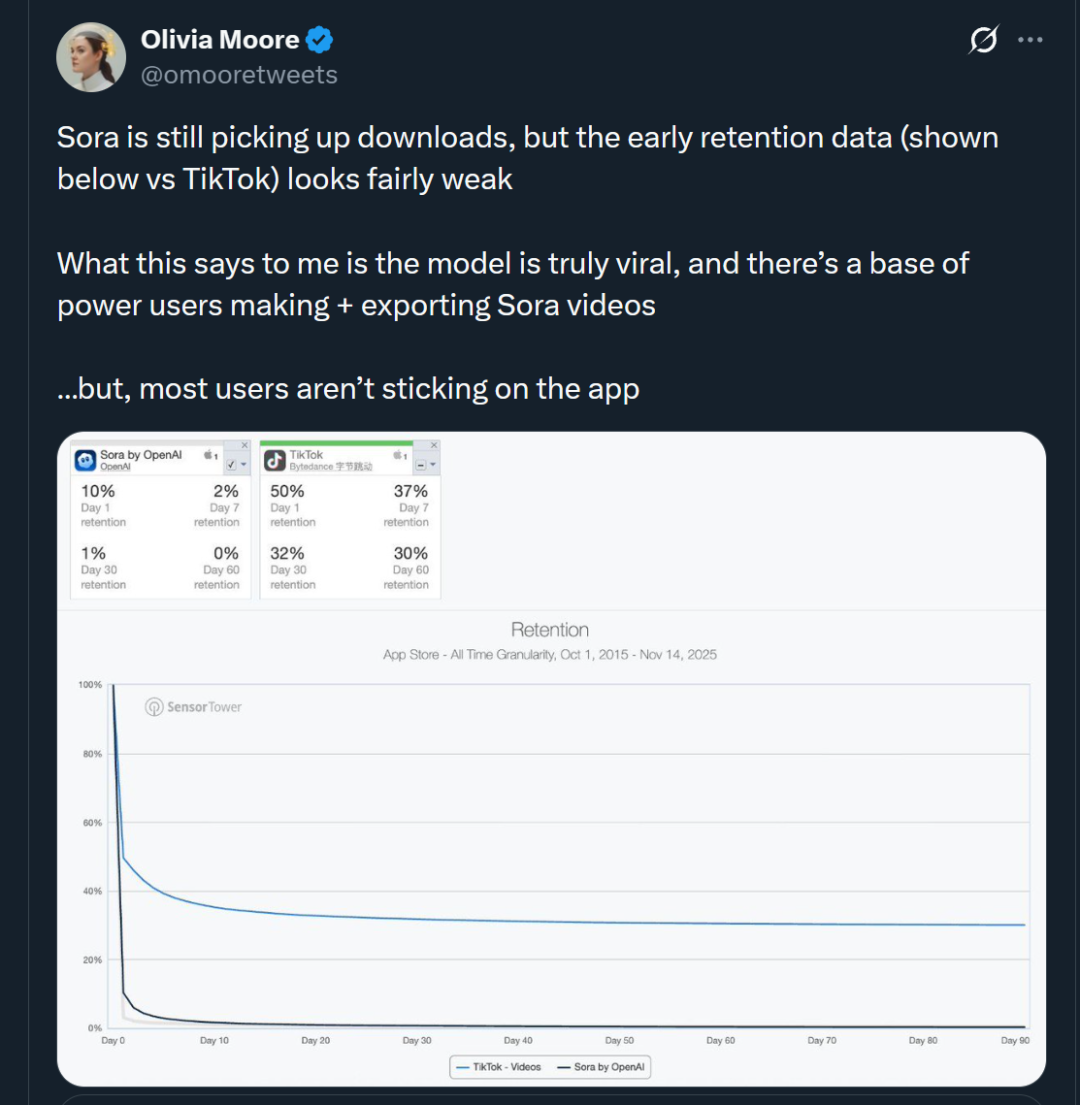 留下来的也大多只是一些创意工作者,他们用Sora APP生成视频后再分发至其他平台。投资人Olivia Moore表示: