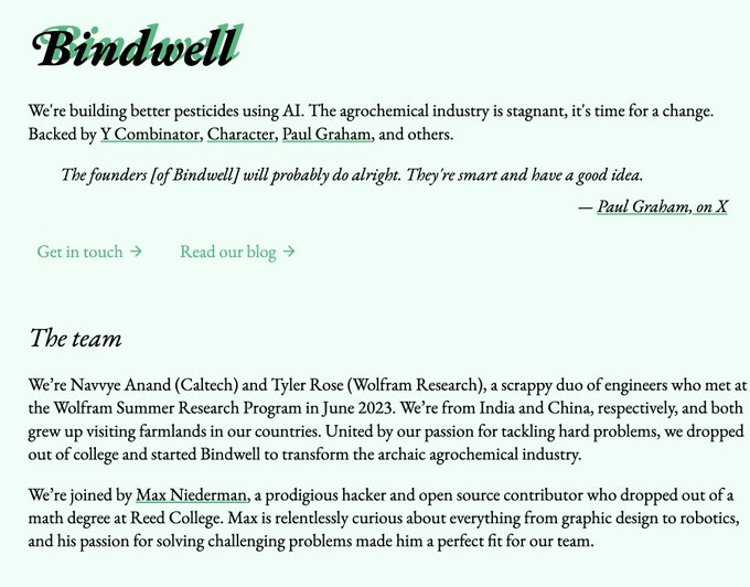 随后,Graham在X上发文称:「Bindwell的创始人应该会做得不错。他们聪明,点子也很好。」