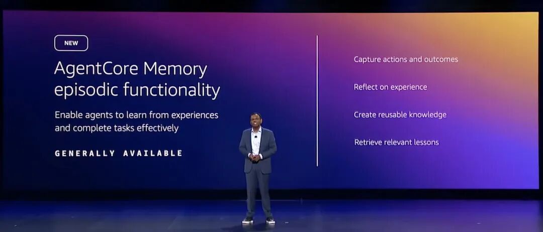 AgentCore Memory 引入了全新的情景式功能,能够帮助 Agent 从过往经验中(上下文、推理、操作和结果)学习,让 AI 随着时间的推移逐步构建对用户的连贯理解,进而输出更加智能化的决策。