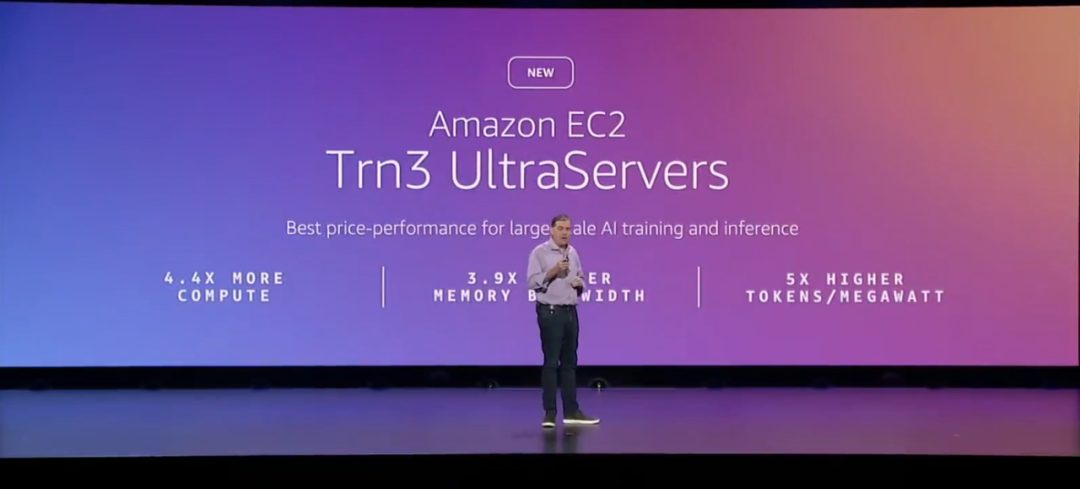 在芯片方面,亚马逊云科技推出了最新的 Trainium 3 (首个云端 3nm 芯片)芯片实例,Trn3 UltraServers 正式全面可用。与上一代相比,新一代在关键性能上实现大幅跃升:计算能力提升 4.4 倍、内存带宽提高 3.9 倍、每瓦可处理的 Token 数量增加 5 倍,为大规模 AI 训练与推理带来显著的效率与能效优势。
