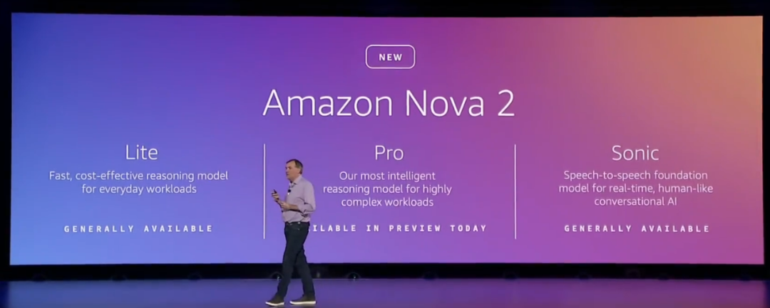 - Amazon Nova 2 Lite:快速、高效、经济的推理模型,适用于多种通用工作负载;
