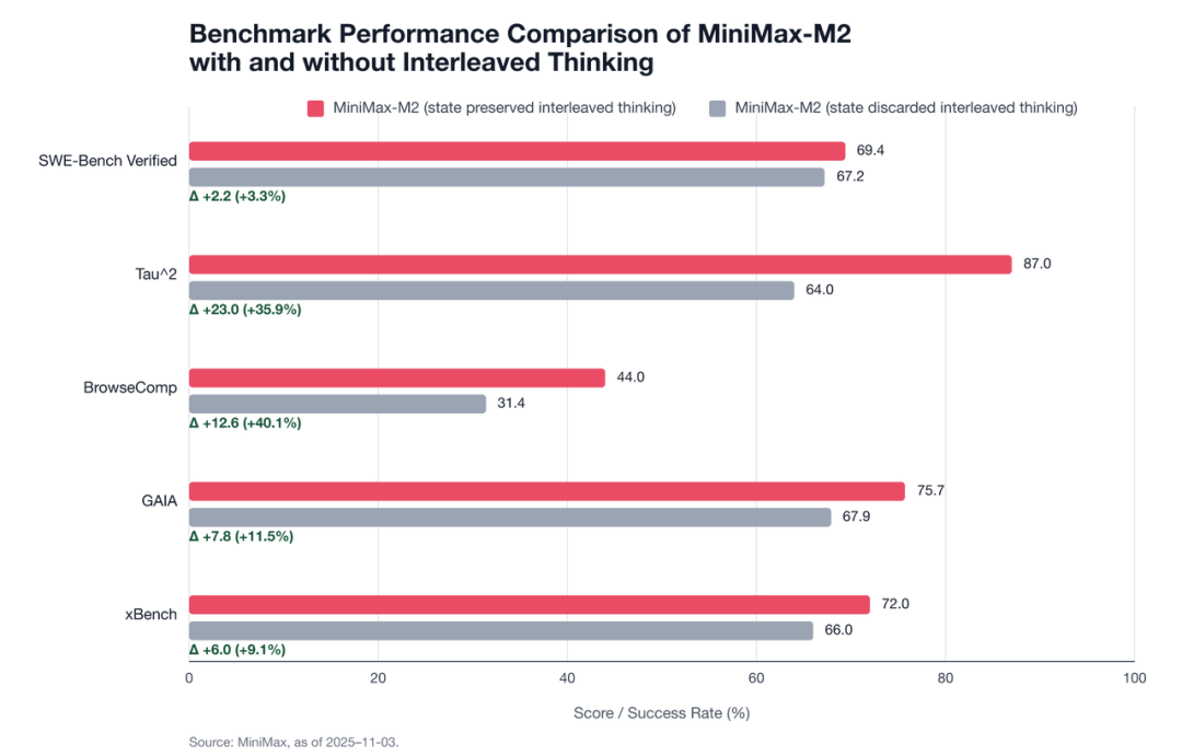 根据 MiniMax M2 的实测数据,保持前轮思维状态带来了显著的性能提升:在充满不确定性、极度依赖「观察 - 调整」循环的 BrowseComp(网页浏览任务)中,保持前轮思维状态让性能从 31.4 跃升至 44.0,涨幅高达 40.1%;在 Tau² 复杂工具调用测试中,性能提升了 35.9%;即使是在本就极高难度的 SWE-Bench Verified 软件工程基准上,也依然取得了 3.3% 的显著增长。