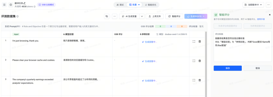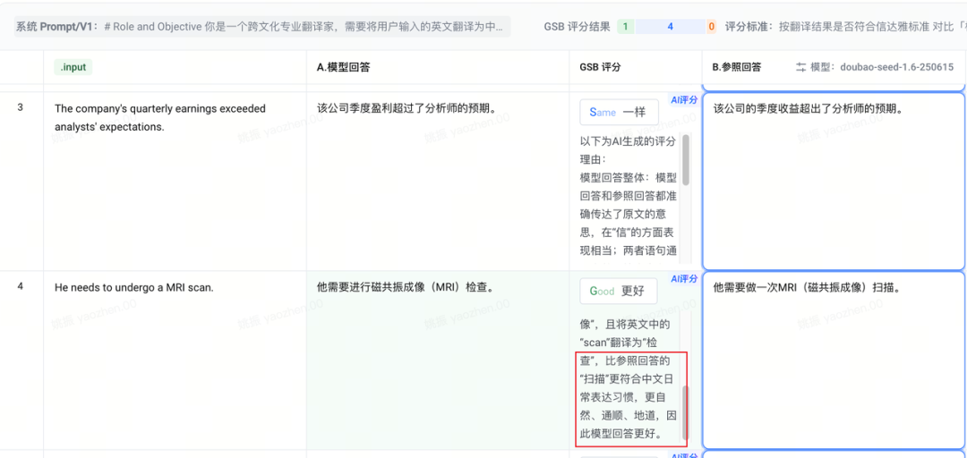 一般流程是批量跑然后打标,打标简单来说就是和参考答案做比较,如果是逻辑题、数学计算等可以直接判断的,用准确率做最终结果。如果像本文的例子翻译场景有一定主观性,常见做法就是对结果量化打分,也有两种模式,一是 3 分或者 5 分制,对比参考答案得出总分(精准量化)。另一种是 GSB 比较模式,对比 A、B 两种回答,判断“G 更好/S 等同/B 更差”,更加简单。