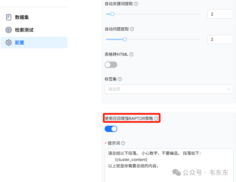 这里需要特别说明的是,在RAGFlow中创建知识库环节,自动关键词/问题提取不是LLM-based Chunking,而是分块后的 LLM 增强。但RAPTOR(递归摘要树,多粒度检索) 策略涉及对初始块进行聚类,并使用 LLM 对聚类进行摘要,生成新的、更高层次的“摘要块”。 这个策略可以被认为是“基于 LLM 的分块”的一种高级形式或应用。虽然它可能建立在初始分块之上,但它确实利用 LLM 生成了新的、语义层级更高的块(摘要),这些新块是文档内容的一种 LLM 驱动的重新组织和分割。它不仅仅是分析现有块,而是创造了新的块边界和内容。