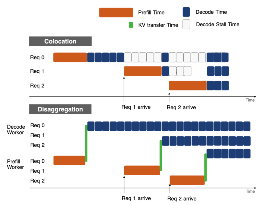 | 核心架构 | Prefill和Decode任务在同一组GPU上混合执行。 | Prefill和Decode任务在两组独立的、专用的GPU集群上执行。 |