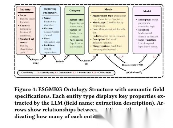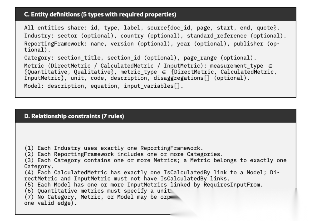 先告诉AI要提取5类信息(实体):行业(比如银行业)、披露框架(比如SASB)、分类(比如环境类指标)、具体指标(比如碳排放强度)、计算模型(比如碳排放怎么算);也就是一个是ESGMKGschema,包括5类实体(Industry、ReportingFramework、Category、Metric、Model)、5类关系谓词、7条结构规则;再定好这些信息之间的关系(比如“银行业”用“SASB框架”,“SASB框架”包含“环境类指标”);