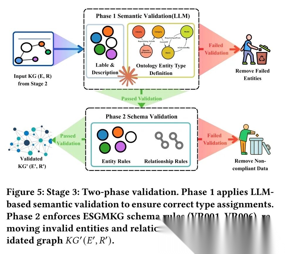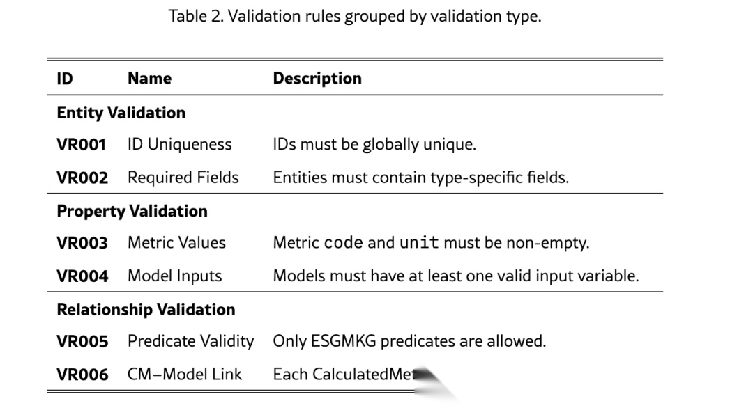 一个是语义验证,由LLM执行,核心作用是校验每个实体的标签和描述是否与其分配的ESGMKG类型匹配,直接剔除类型错误的实体及依赖关系,解决“实体类型幻觉”问题,减少后续无效校验,例如确认提取的“碳排放强度”确实是ESG指标,而不是财务指标(比如净利润),防止类型认错;