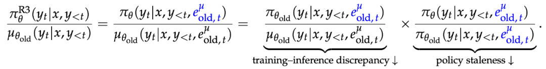 R3 的目标是减轻专家路由对训练 — 推理差异的影响,其实现方式是在训练引擎中统一复现推理引擎中 rollout 策略所选定的路由专家。这一做法不仅降低了训练 — 推理差异,也同时缓解了专家路由对策略陈旧的影响: