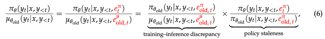 为了使上述一阶近似有效,需要满足一个关键条件:目标策略 π_θ 与 rollout 策略 μ_{θ_old} 必须足够接近。这一点乍看不太直观,因此为了便于理解,对于给定的提示 x 和任意 token y_t,团队将其重要性采样权重(IS)重写为: