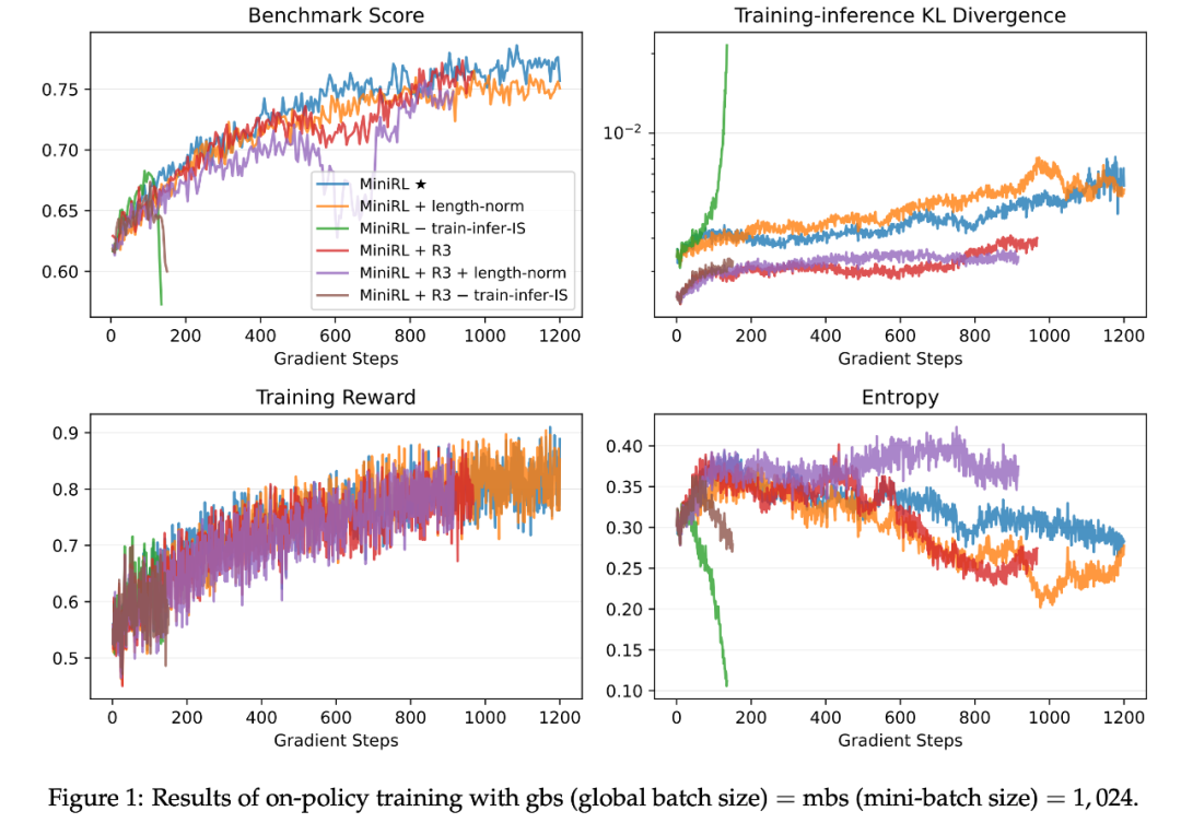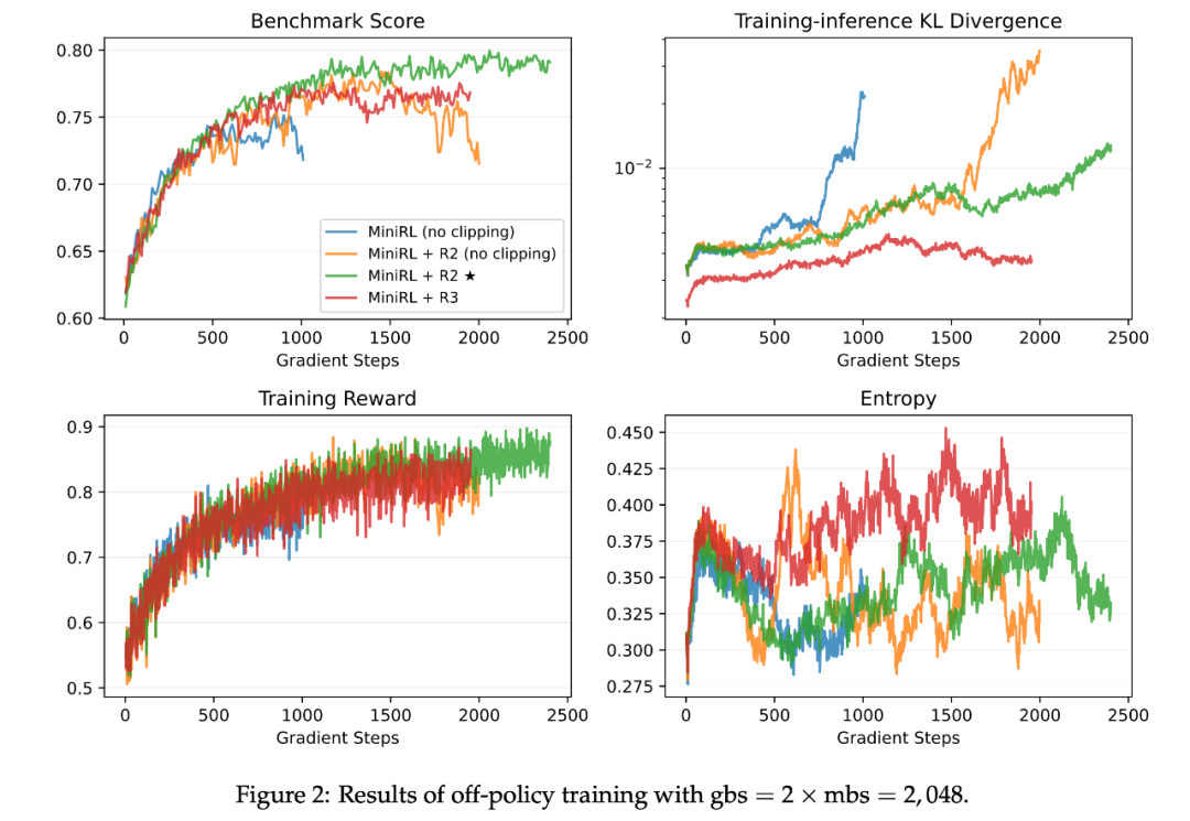 - 在引入 off-policy 更新以加速收敛时(即将大规模生成的响应批次拆分成多个 mini-batch 进行多次梯度更新),要缓解因策略陈旧而导致的不稳定性,就必须同时使用 Clipping 与 Routing Replay;