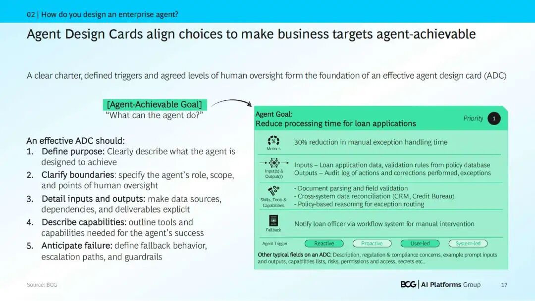 标准化是规模化的基石。我们推行智能体设计卡(ADC)作为蓝图,清晰地定义了智能体的目的、边界、所需的技能和工具,以及预期的回退行为。
