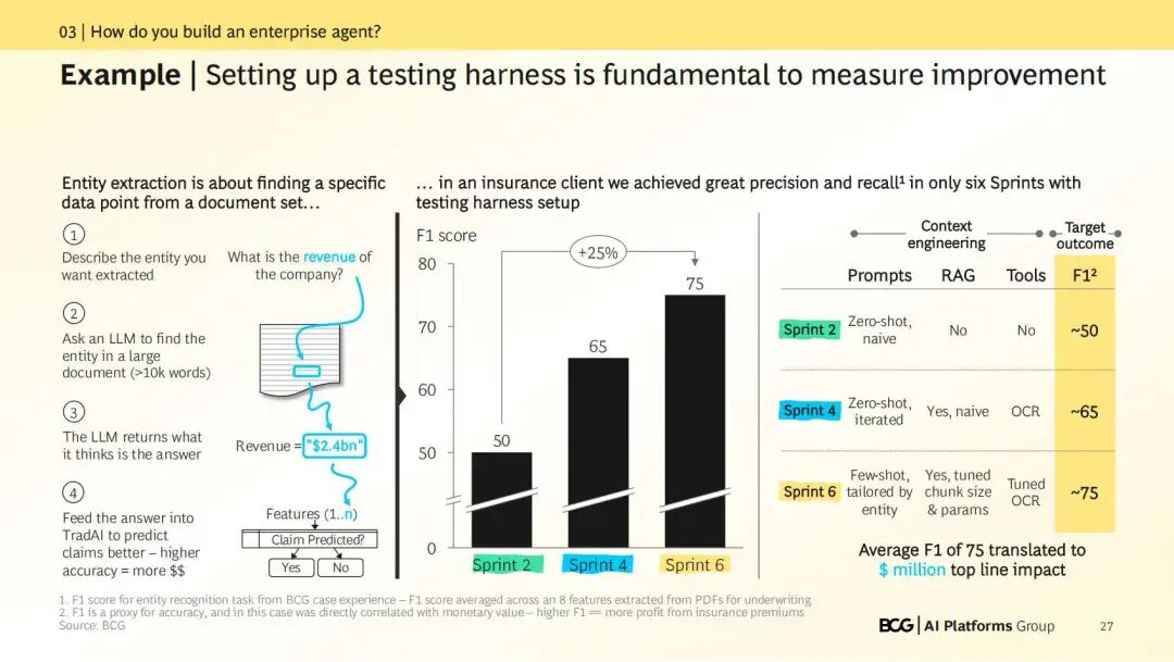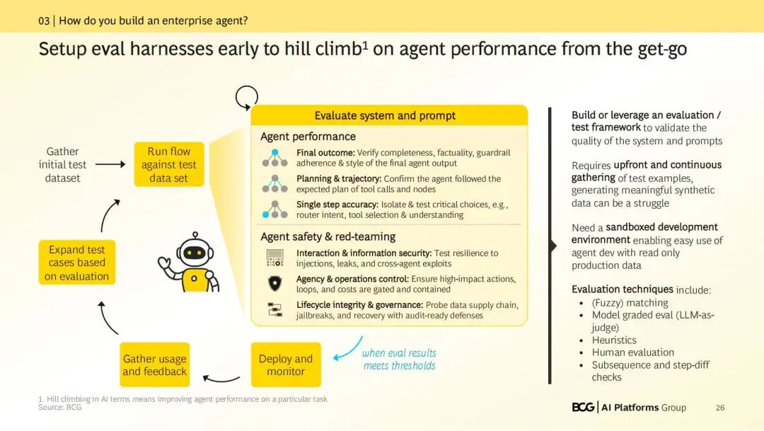 同时,必须提供强大的提示管理、版本控制以及跨智能体轨迹的可观察性。我们强调尽早建立评估线束(“爬坡”),以持续衡量性能提升,确保将分数提高到75%等成果能直接转化为业务价值。
