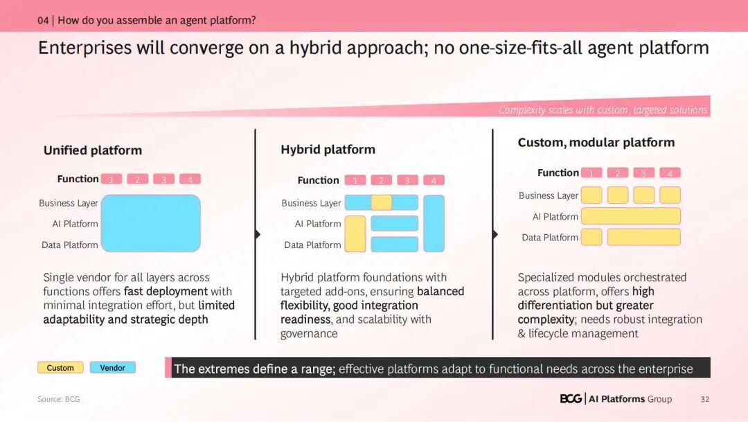 3)数据引力定平台。智能体平台的构建(Build)、购买(Buy)或调整(Adapt)决策,主要取决于企业数据和遗留系统的地理位置和可访问性——即“数据引力”。