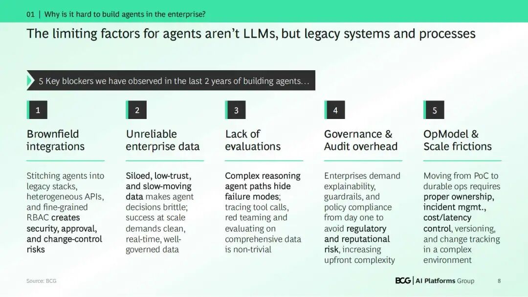 在实践中,限制生产级智能体落地的主要因素并非来自LLM本身的能力,而是由企业内部环境和成熟度所固化的五大关键障碍 :