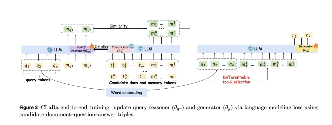 CLaRa 的最大创新在于打破了检索与生成的界限。在离线压缩完成后,文档在系统中仅以“记忆 Token”的形式存在。