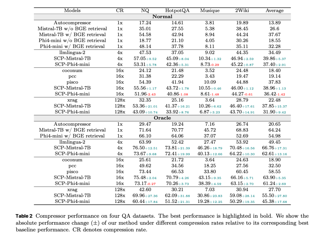 - 4x 压缩率:SCP-Mistral-7B 的平均 F1 达到 39.86。