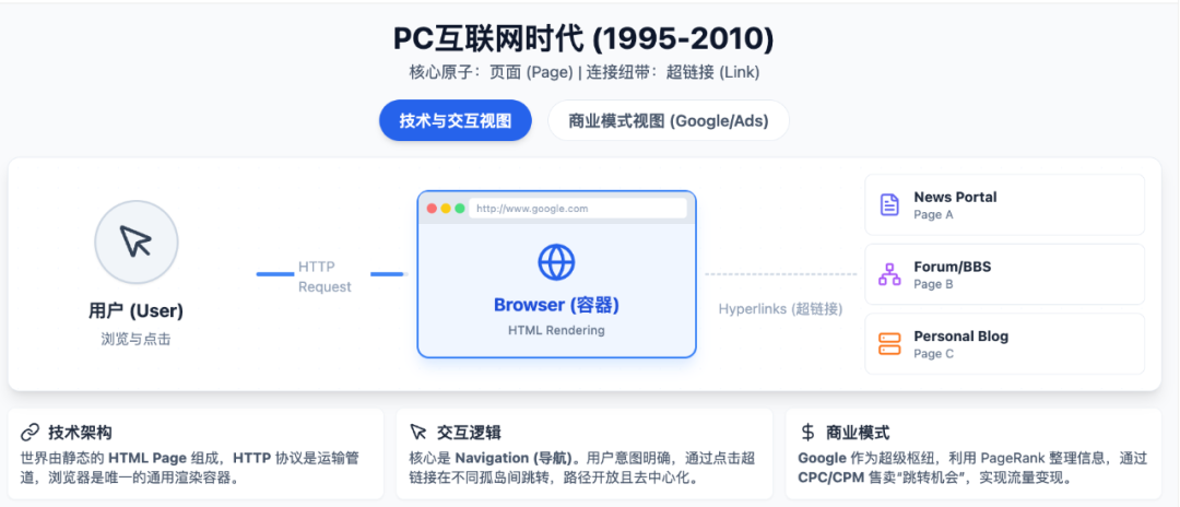 在1995年至2010年的PC互联网时代,数字世界的基本原子是“页面”(Page),而连接原子的纽带是“超链接”(Link)。这一时期的核心技术架构建立在HTTP、HTML等开放协议之上,浏览器作为通用的渲染容器,承载了用户与信息的交互。