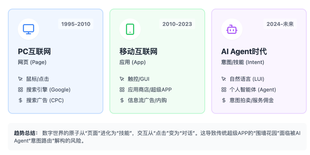 要理解当下AI Agent与APP生态冲突的剧烈程度,必须将其置于互联网发展史的长周期中进行审视。每一次人机交互界面的范式转移,都会引发聚合者权力的更迭,并彻底重构商业变现的底层逻辑。