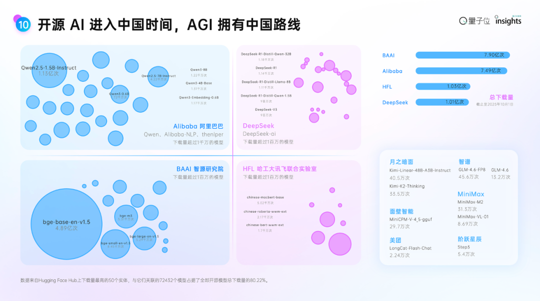 中国AI正从“参与者”转向“领导者”。企业从应用导向转向深度研发,国家层面将AGI置于战略核心,推动技术自主与生态可控。DeepSeek、Qwen等开源模型在全球社区影响力迅速提升,下载量位居前列。