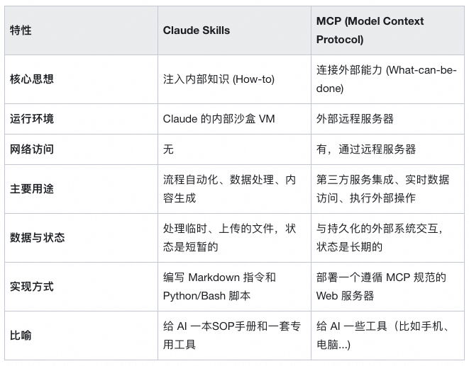 - Claude Skills 是一种基于文件系统的、可复用的知识包,运行在 Claude 的沙盒虚拟机(VM)环境中,用于向 Agent 注入流程化、确定性的内部知识(SOP)的标准化方案。