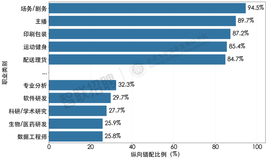 求职过程中纵向及横向错配在不同职业中呈现出鲜明的差异。如图 2所示,纵向错配发生概率低(教育适配度高)的是学历门槛较高、专业性较强的职业,如数据工程师、生物/医药研发等;而演艺类、体力型等学历门槛较低的职业反而更会青睐高于职业需求学历的求职者,如主播、印刷包装职业等。
