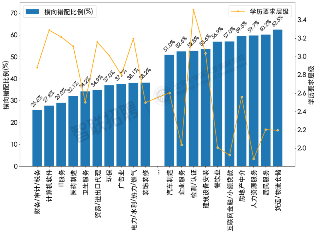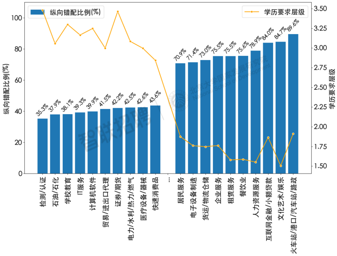 图 8和图 9分别展示了不同行业(按照智联二级行业分类)的纵向错配与横向错配比例。结果显示,不论纵向维度还是横向维度,技术密集型行业(如信息技术、能源化工)错配比例普遍较低,而服务导向型行业(如物流、餐饮)中错配现象更为严重**。**图中同时呈现了不同行业的学历要求层级,学历要求与错配比例高度相关。纵向错配比例低(高)的行业往往是学历要求高(低)的行业,而横向错配与学历要求的相关性相对较弱。