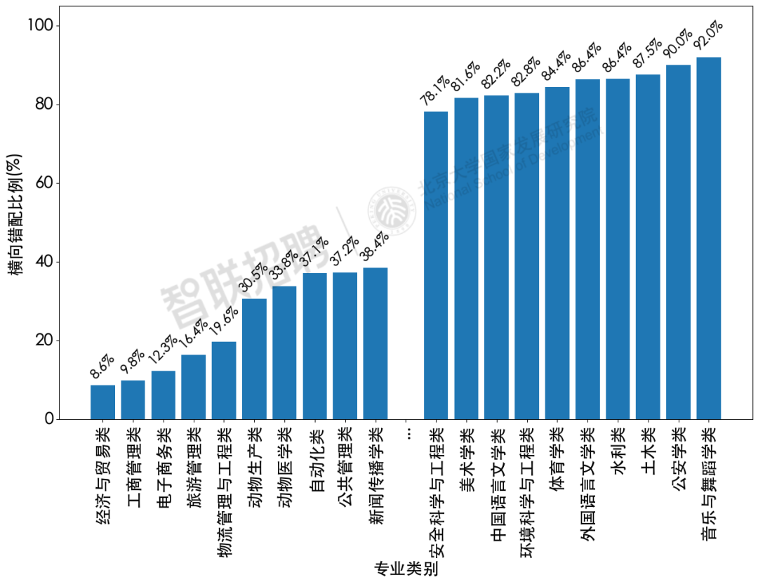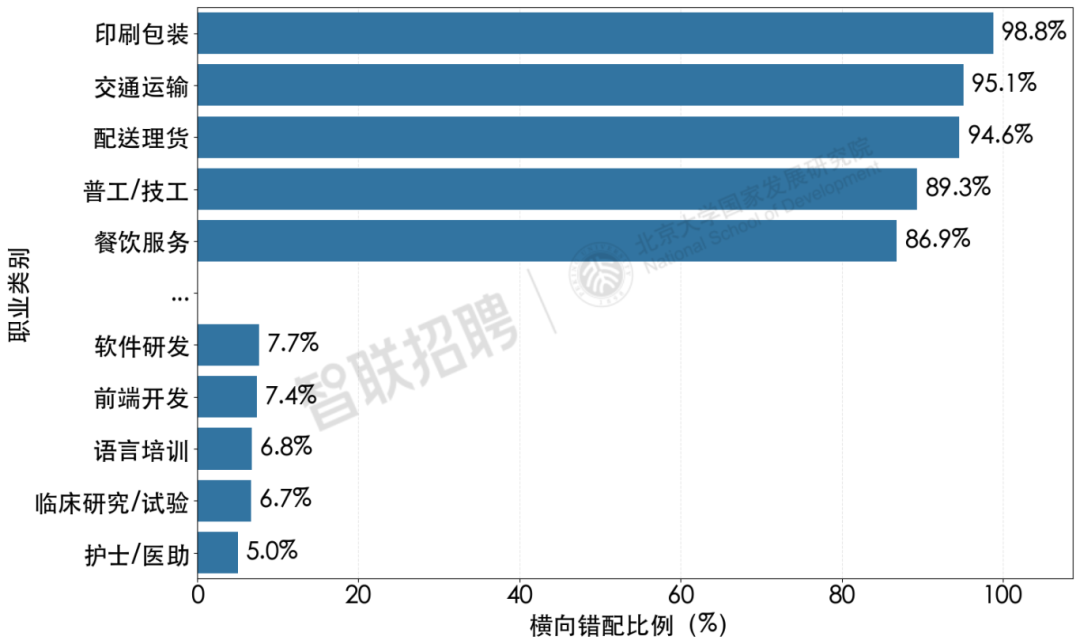 如图 3所示,横向错配比例低(专业适配度高)的是一些技术性、专业性较强的职业,比如医生和软件研发相关职业;错配比例高的多为一些不依赖于特殊的专业技能的体力工作职业,如物流运输相关的职业。