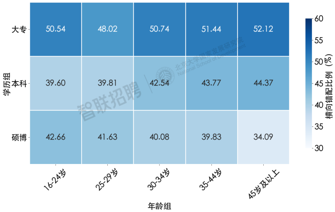 在横向错配方面(见图 5),从学历维度分析,研究发现大专学历的求职者的横向错配比例最高,相比本科及以上学历的求职者高出10个百分点。这可能与大专学历求职者的专业技能相对基础、职业选择灵活性较高有关;年龄维度方面,大专学历求职者的横向错配比例对年龄不敏感,基本保持稳定,**本科学历求职者的错配比例随年龄增长略有上升,而硕士、博士学历求职者的错配比例随年龄增长则呈现明显的下降趋势。**这可能说明硕士、博士求职者锁定专业性相对更强的职业,并随着工作经验的积累愈趋专业化。相对而言,本科学历的求职者则随着工作经验的增长趋于多元化,专业的适配性下降。