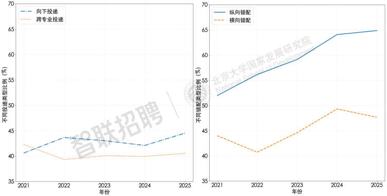 对比来看,考虑了需求侧的市场反馈后,“纵向错配”比例显著高于“向下投递”,随时间推进有加剧趋势。可能是由于高学历求职者的供给增加,且用人单位对高学历求职者的选择越来越多。然而,这可能导致原本恰好符合岗位学历要求的投递者逐渐被排除在外,导致了纵向错配现象的增多。**“横向错配”比例也略高于“跨专业投递”,随时间亦有加强趋势,**这可能是由于近年来跨领域、复合型人才需求的上涨。