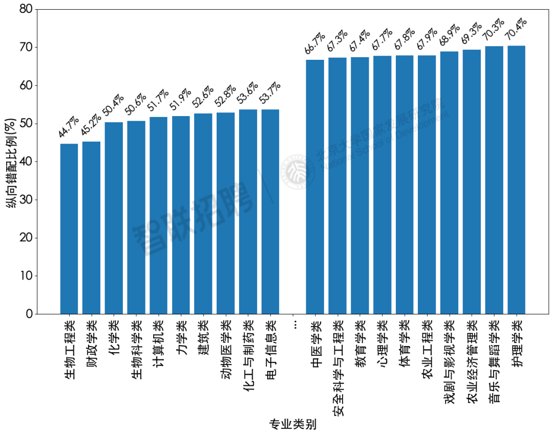 图 6和图 7表明,求职者不同专业背景下的错配比例也存在明显差异。纵向错配比例较低的多为专业技能导向性强、学历门槛较高的专业,如生物工程师类、计算机类;横向错配比例较低的多为相对通用、职业匹配面较广的专业,如公共管理类、工商管理类。而艺术特长类专业的纵向错配和横向错配比例均较高,如音乐与舞蹈学类、体育学类、美术学类**。**此外,横向错配比例较高的专业,也可能是由于对口工作机会不足而投递其他领域。